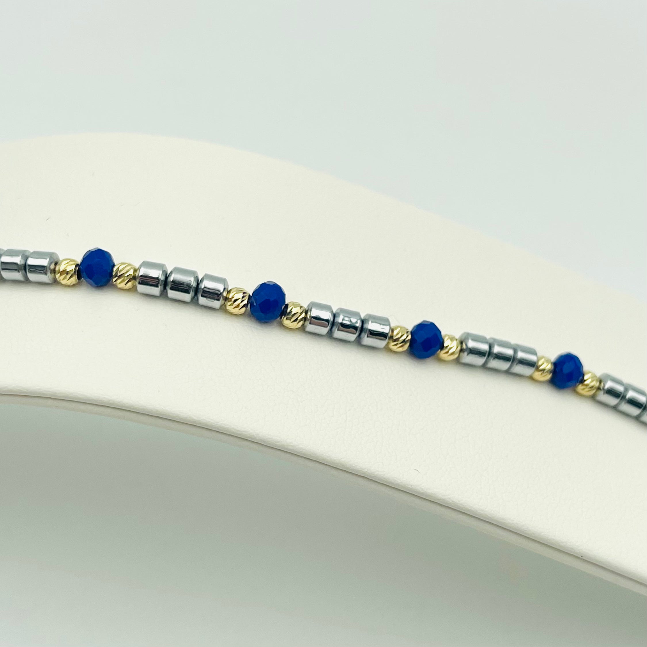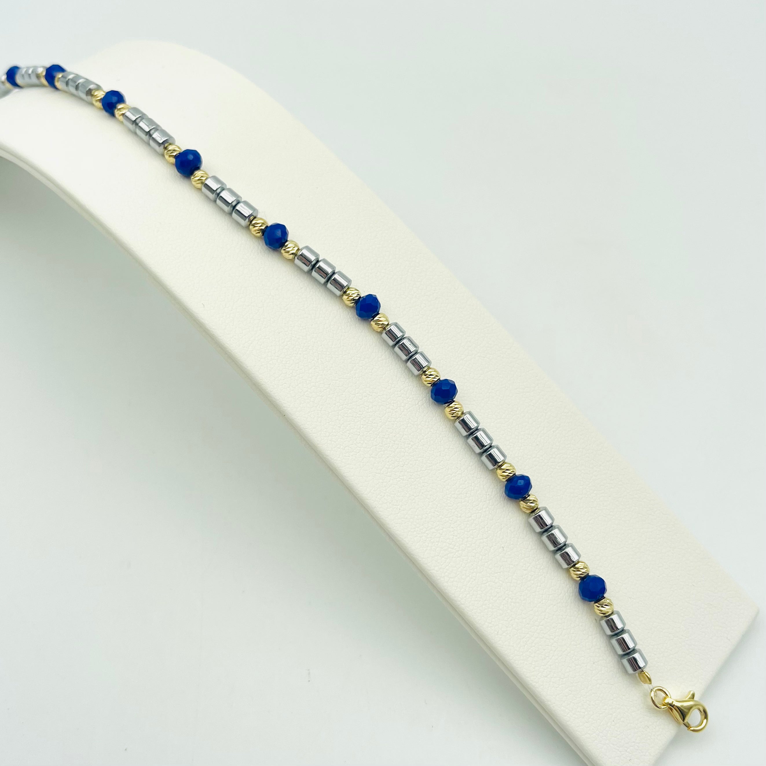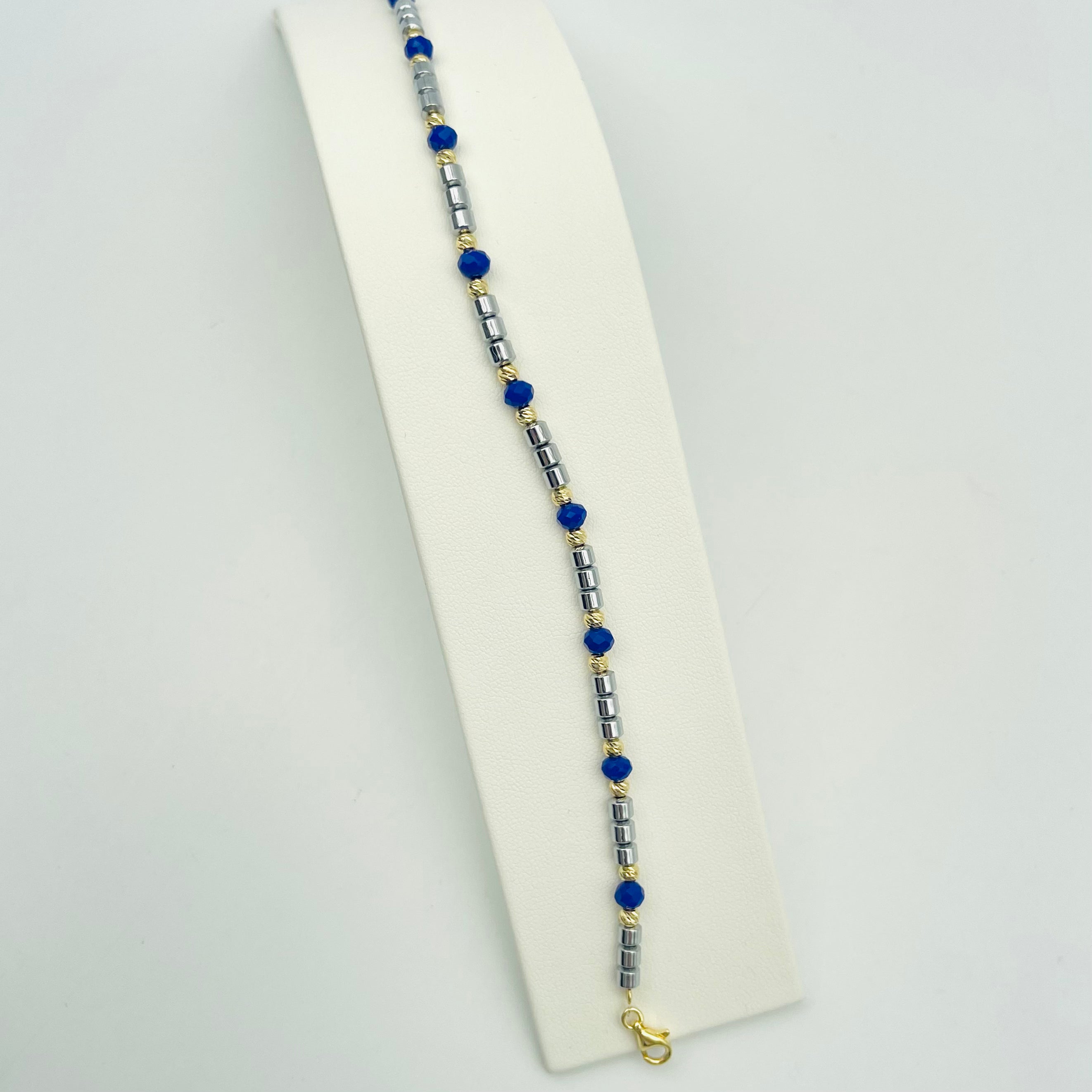 Bracciale in argento colore giallo con cilindretti in ematite bianca -palline argento colore giallo e pietre colore blu.