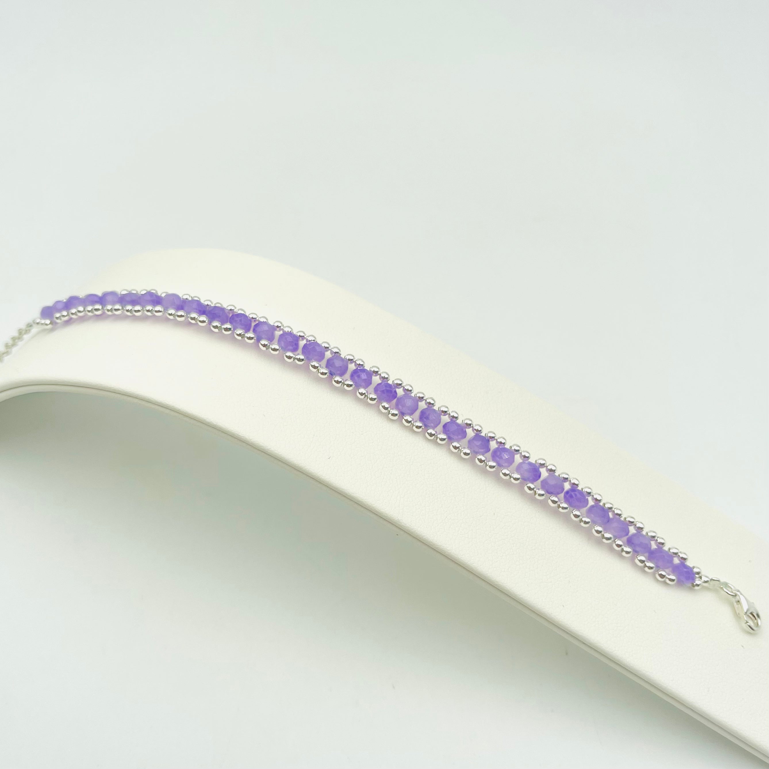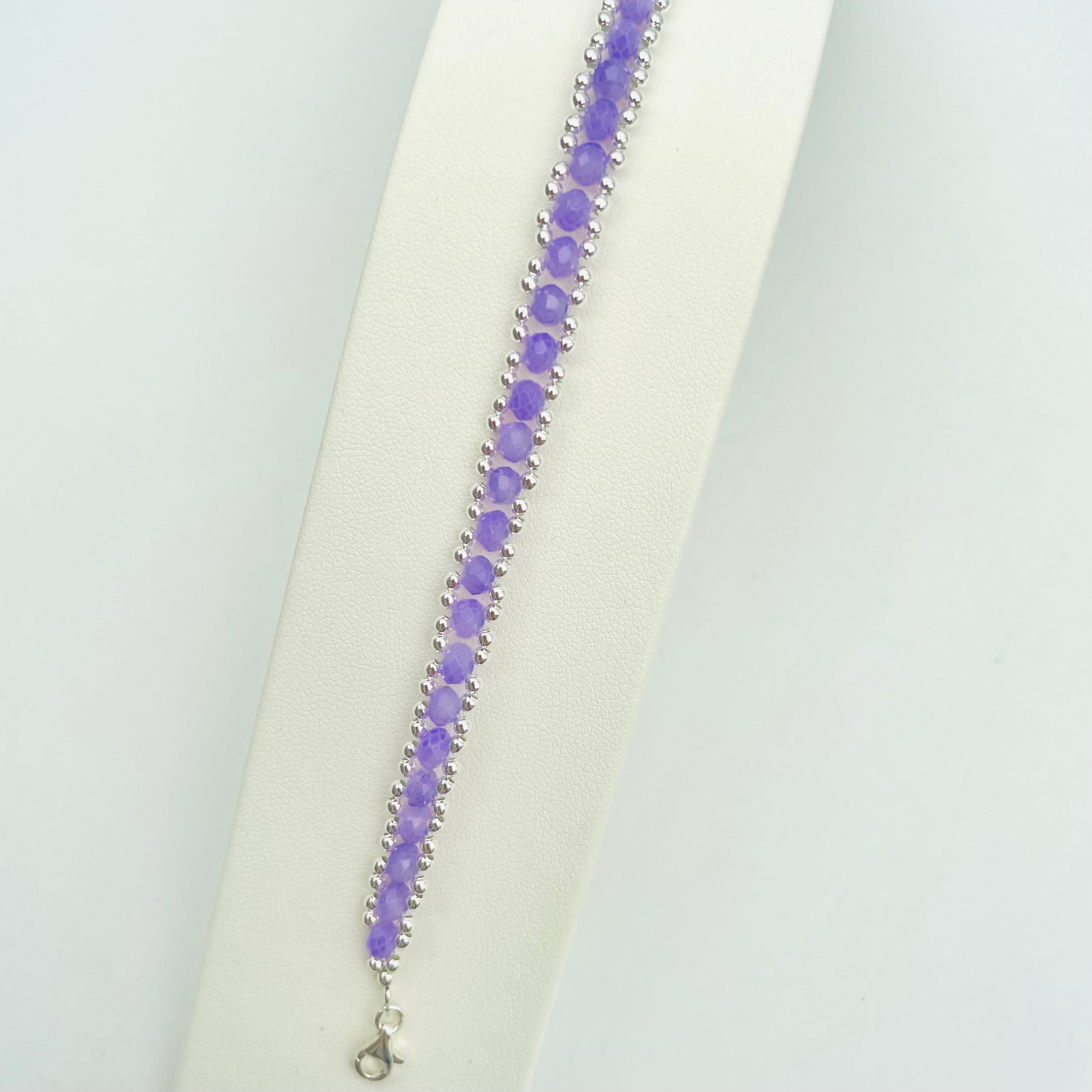 Bracciale in argento colore bianco con palline in argento bianco e pietre sfaccettate colore lilla.
