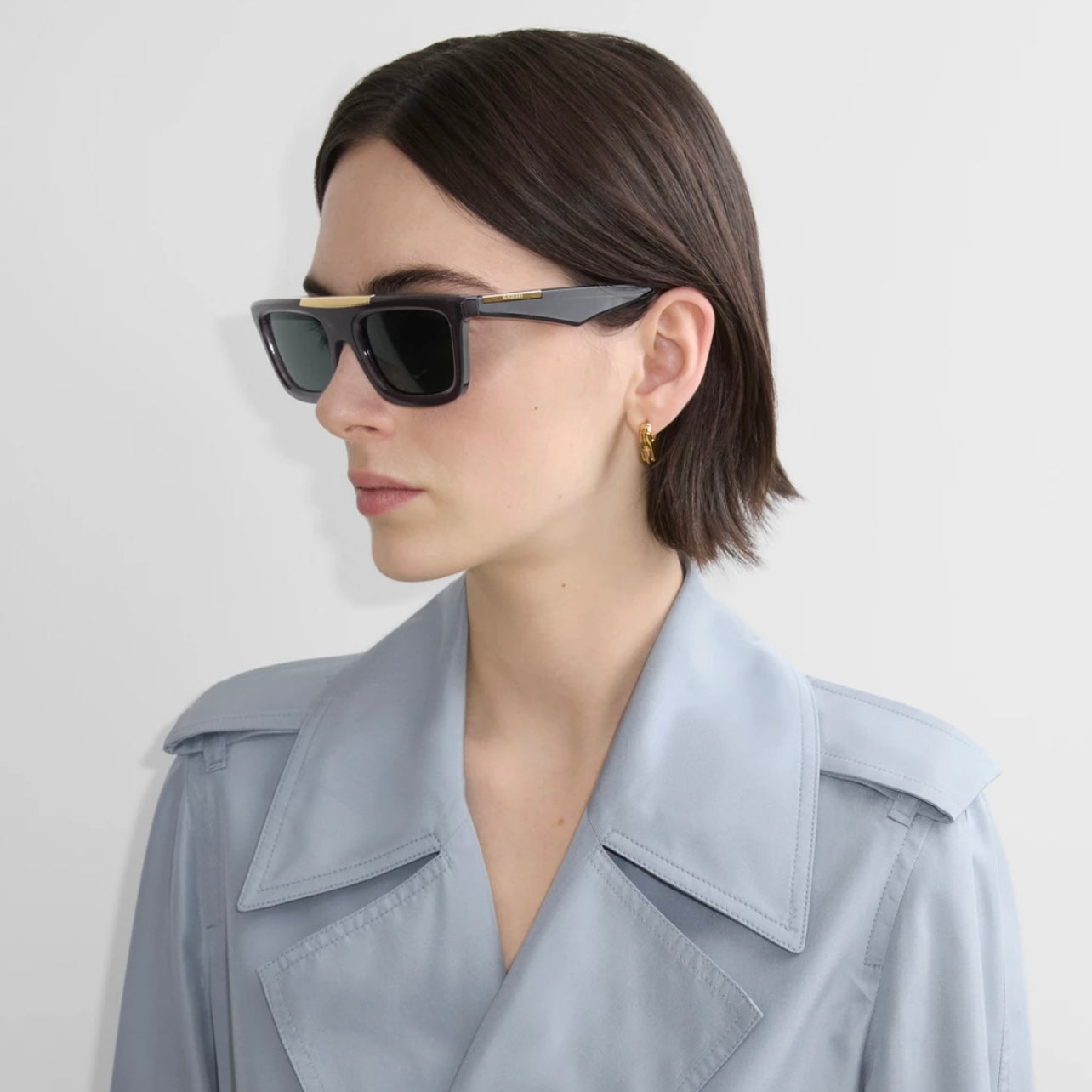 Occhiali da sole con montatura rettangolare realizzati in Italia in nylon e acetato, con barra superiore in acciaio lucido e aste scultoree. Gli elementi metallici sono impreziositi da logo e motivi Burberry incisi.