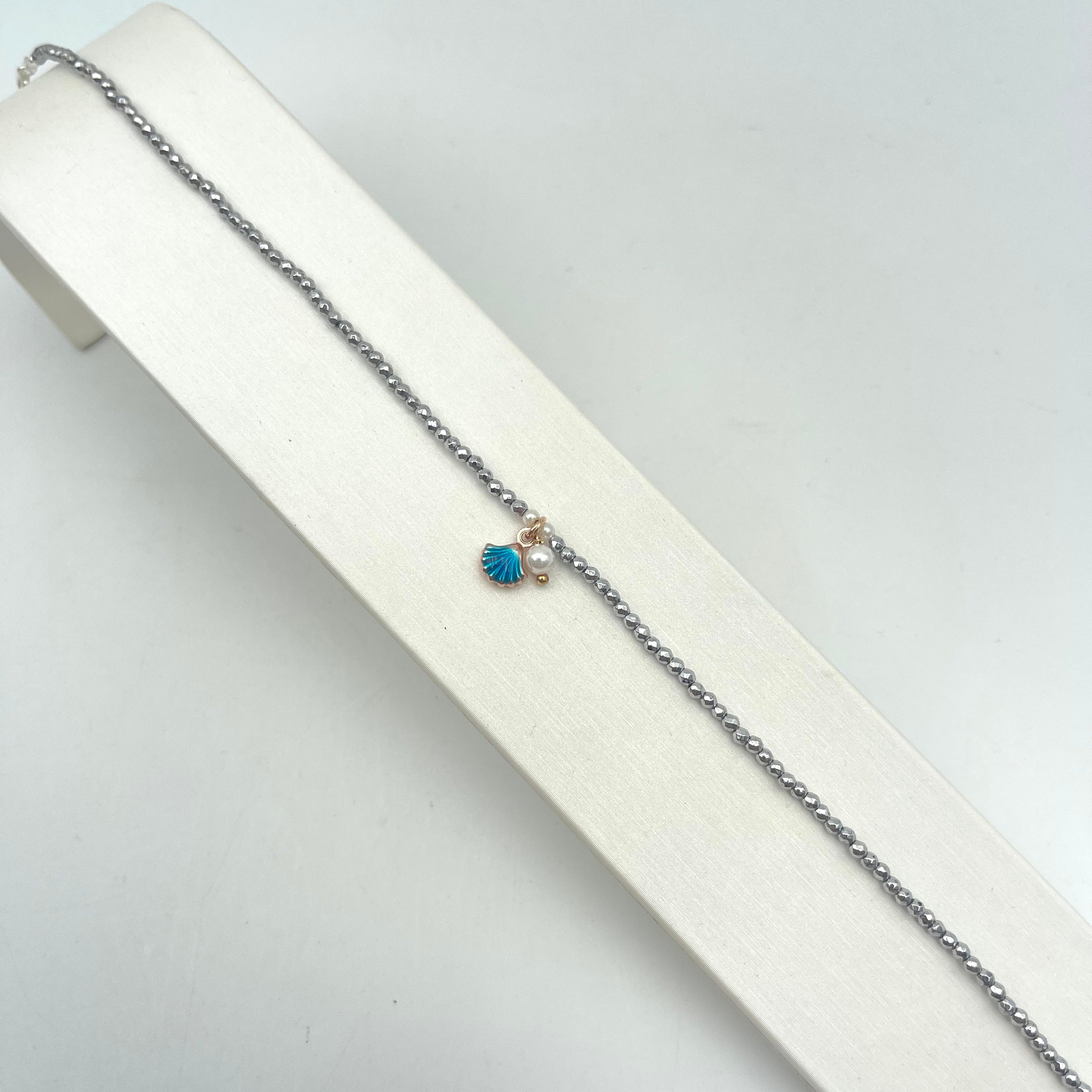 Cavigliera in argento colore bianco con palline sfaccettate e ciondolo smaltato a forma di conchiglia. con perla.