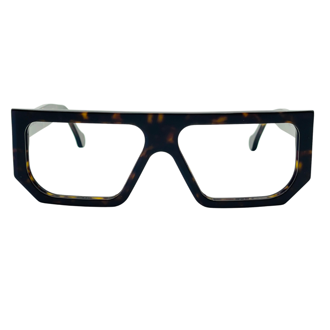 Occhiale dalla forma squadrata con taglio netto sulla parte superiore del frontale.