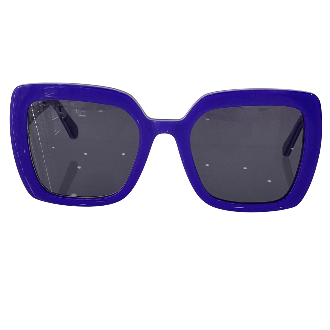 Colore viola lucido, lenti tinta unita colore grigio, serigrafate.