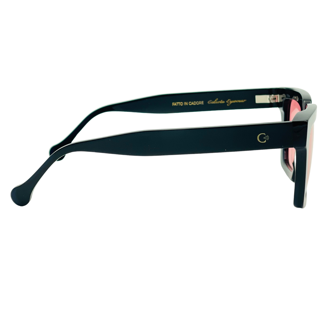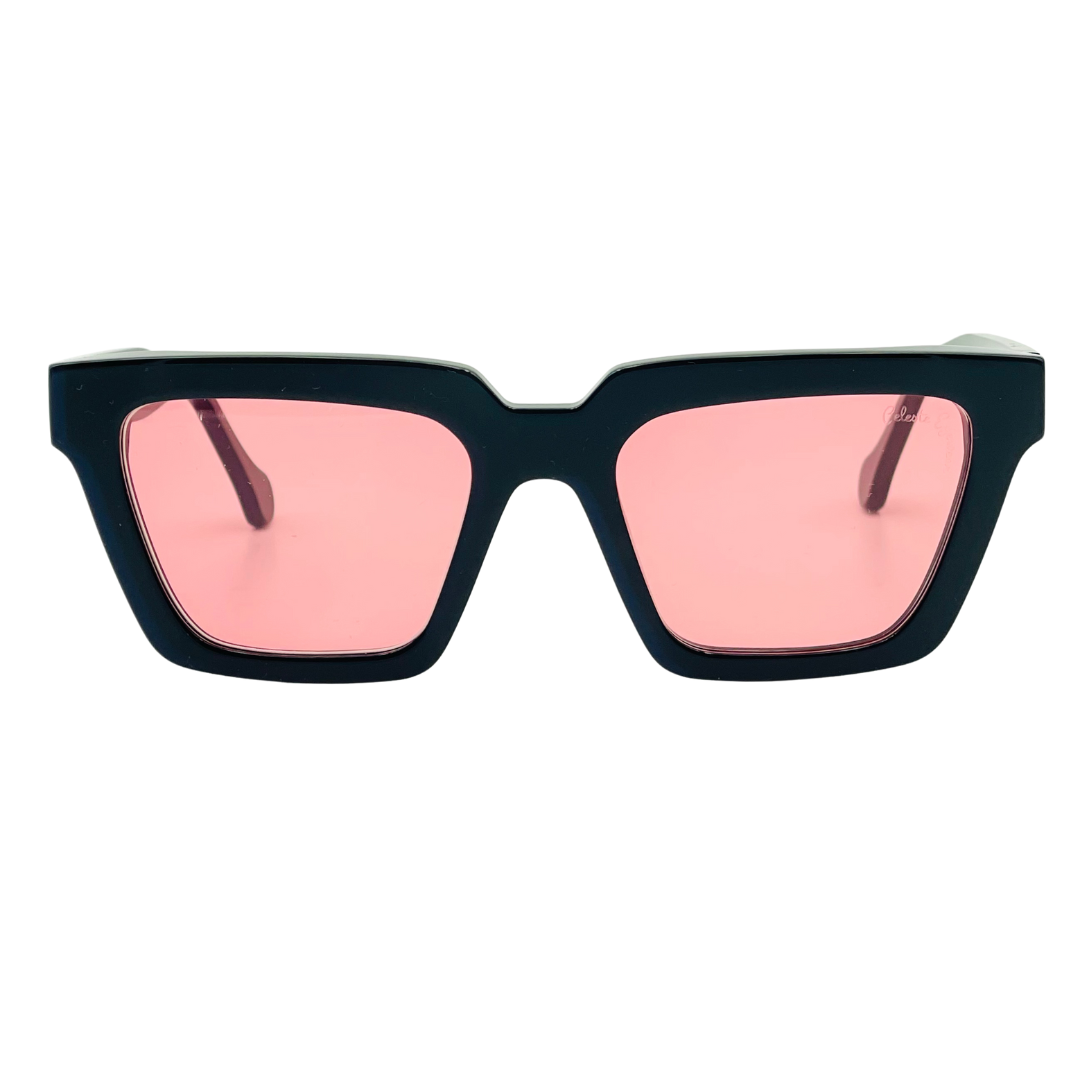 Colore nero lucido, lenti tinta unita colore rosa, serigrafate.