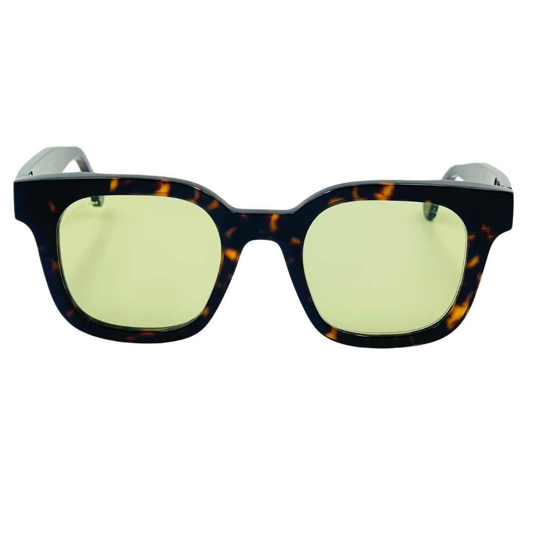 Colore havana lucido, lenti tinta unita colore verde, serigrafate.