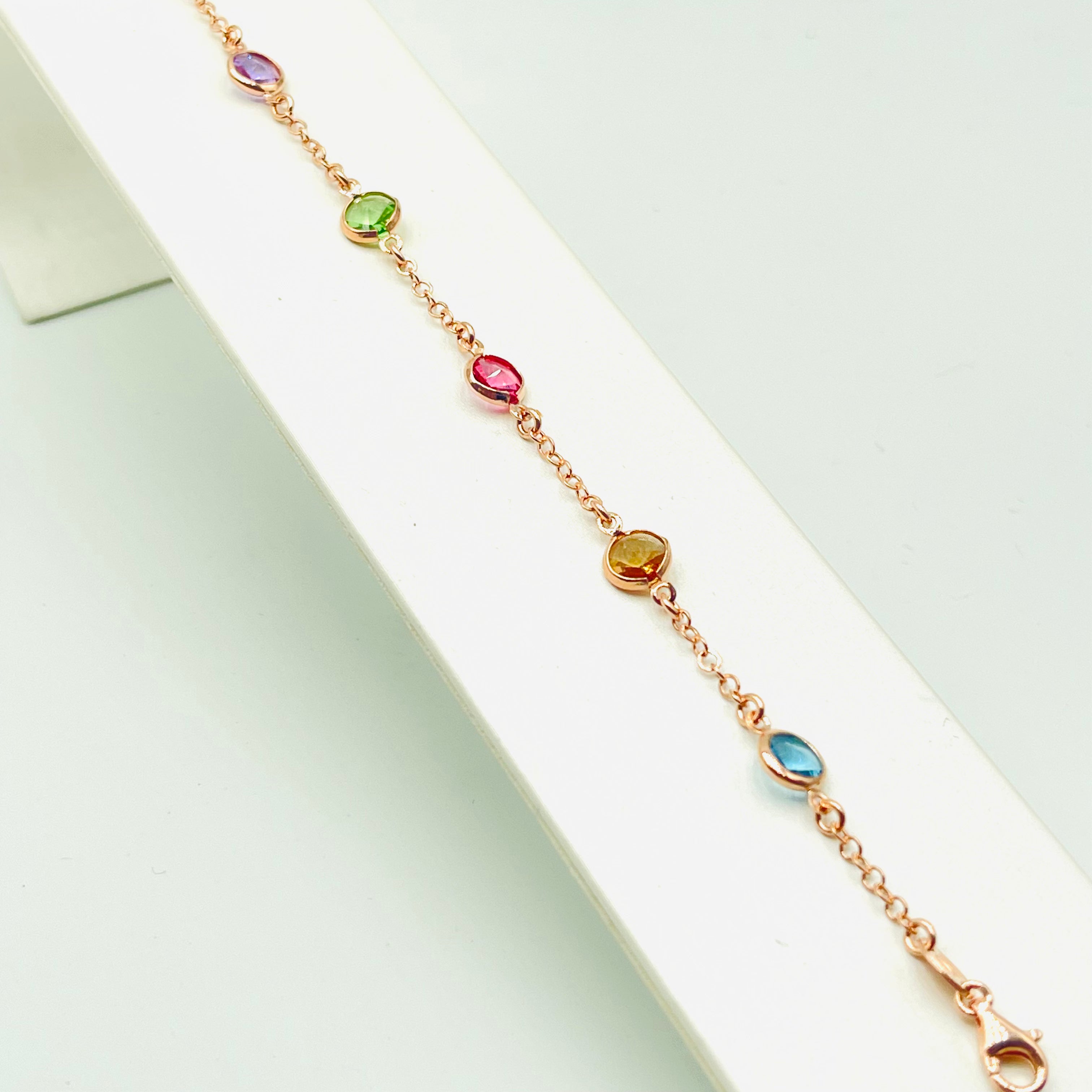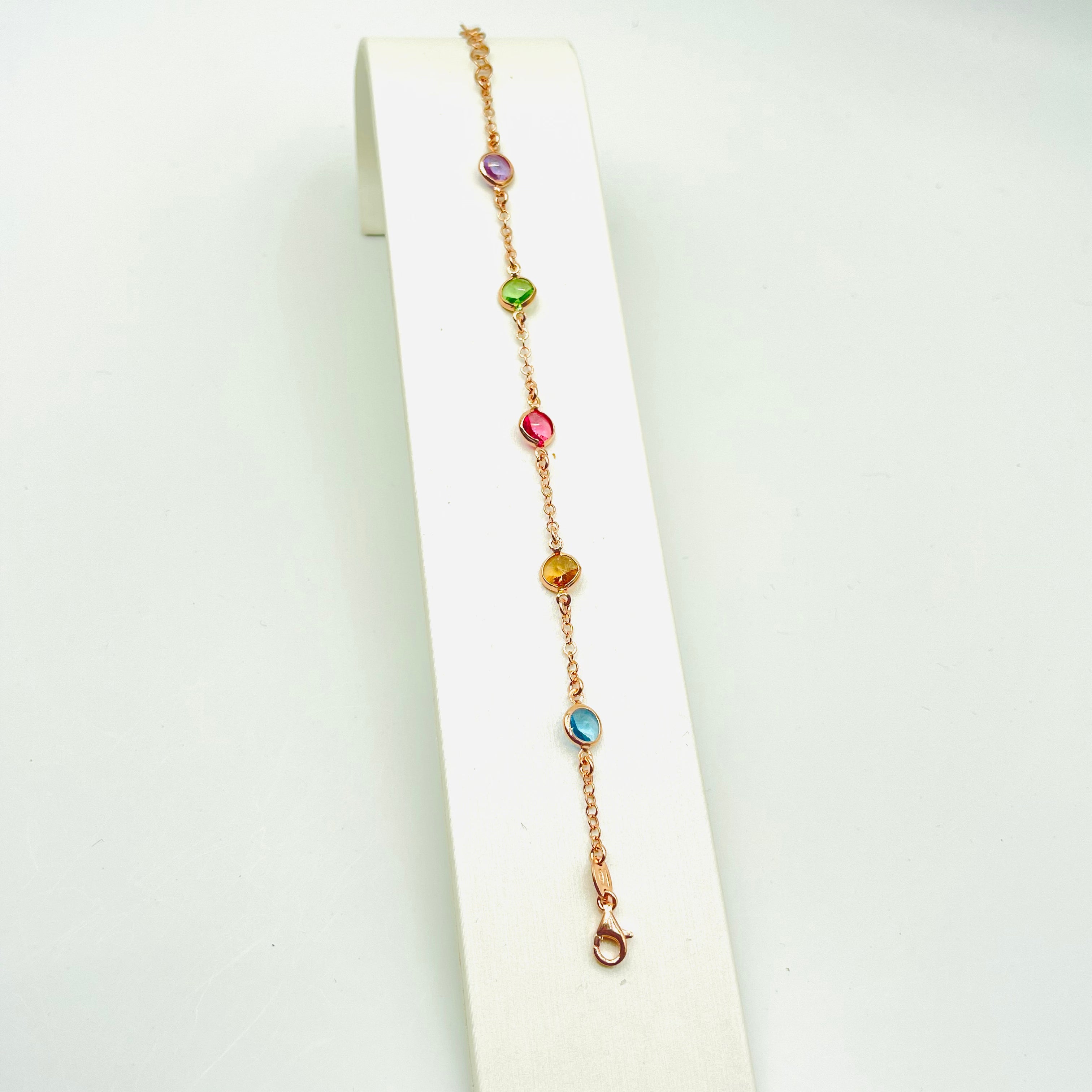 Bracciale in argento colore rosè con zirconi colorati.
