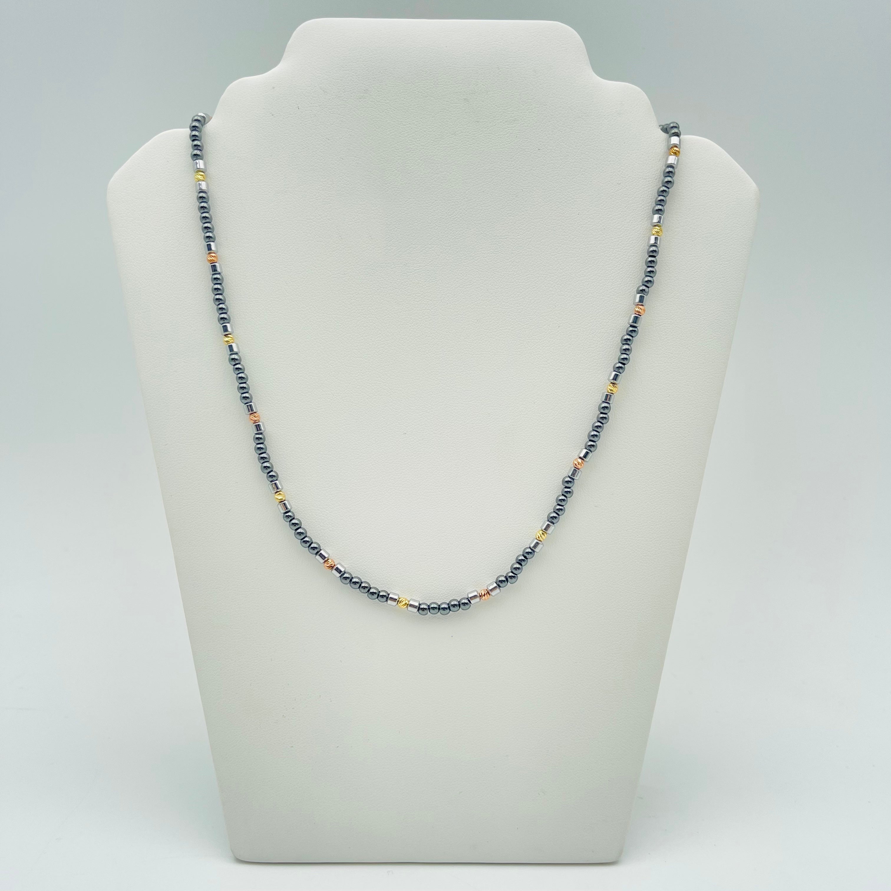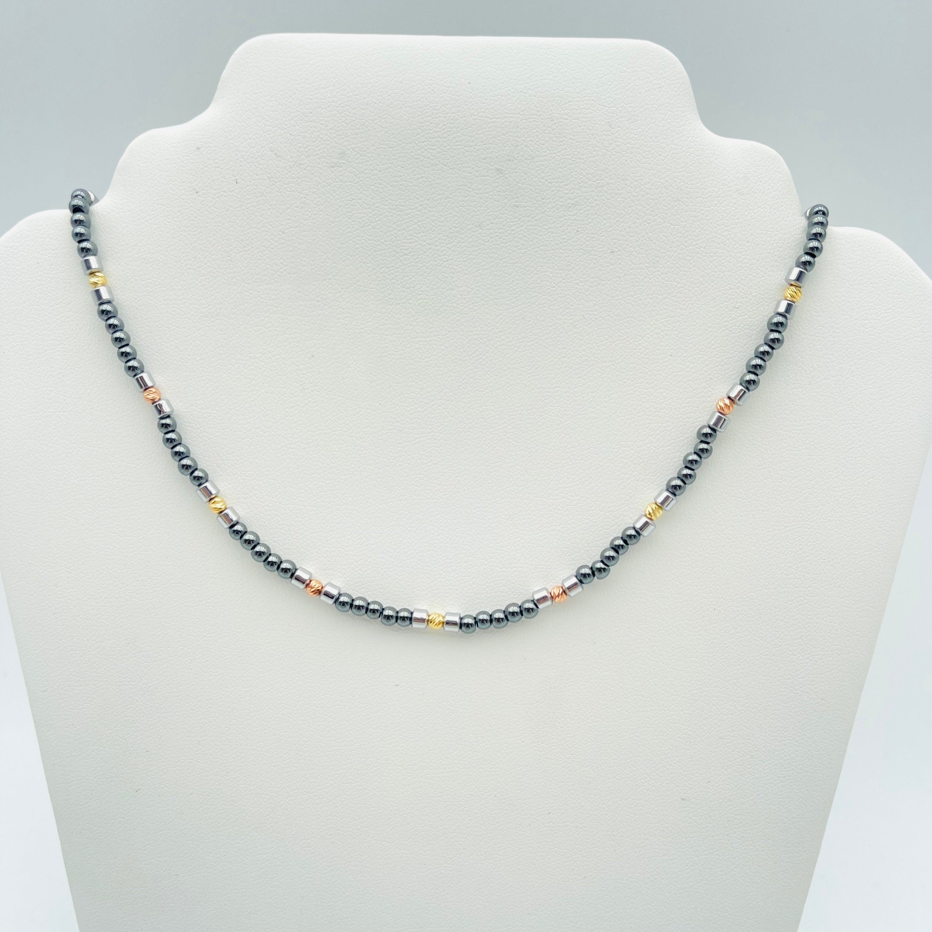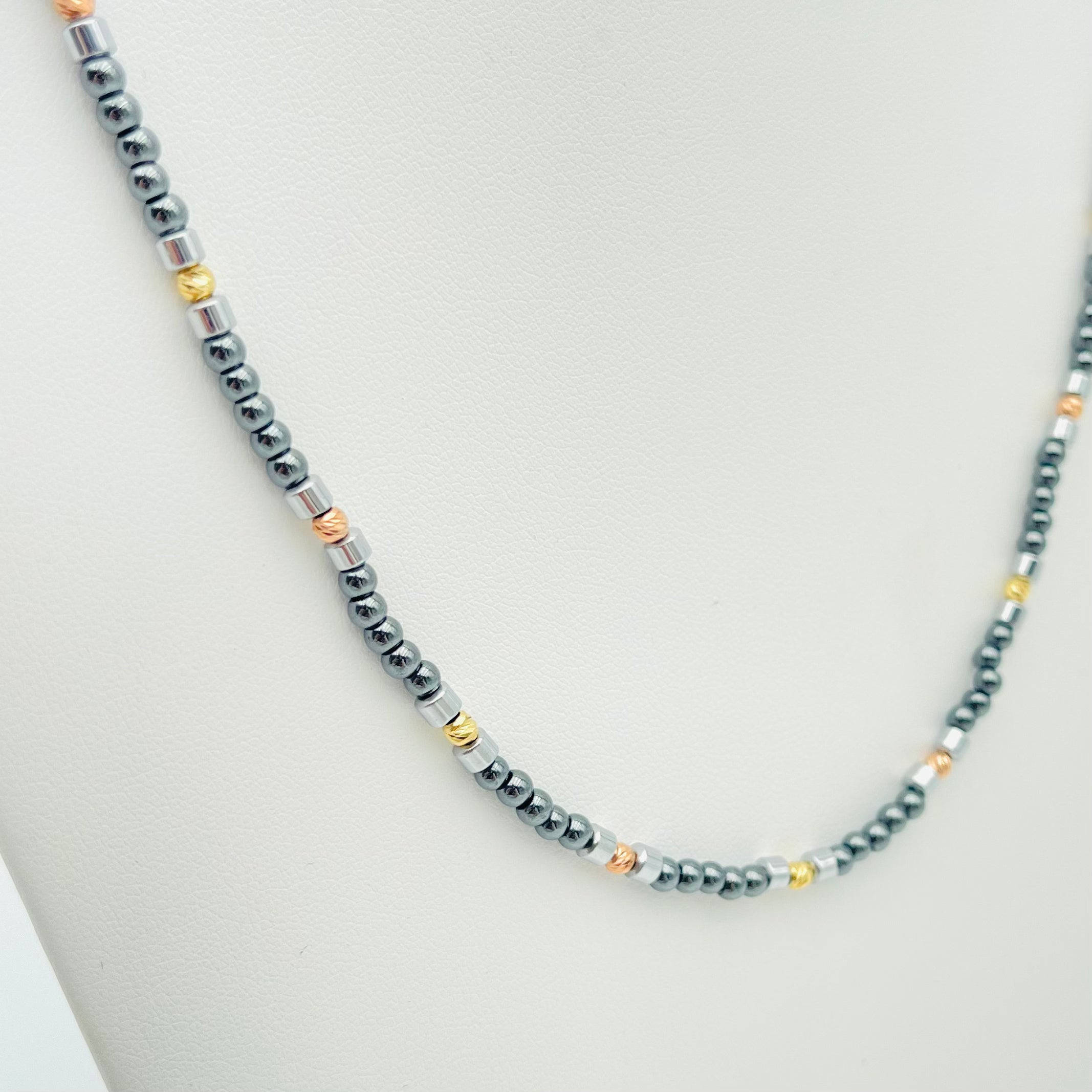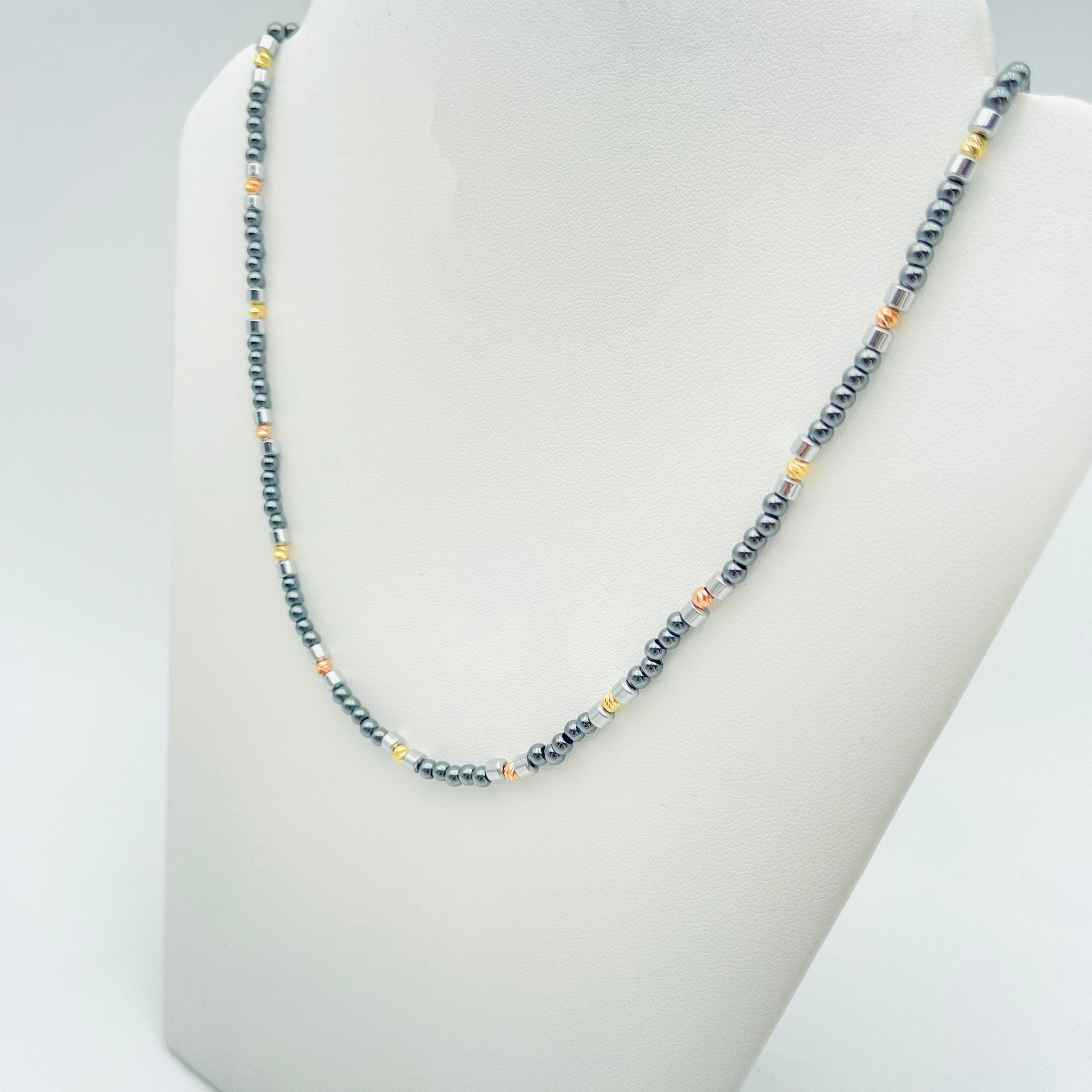 Catenina in argento con palline colore canna di fucile, dischetti colore bianco, palline sfaccettate colore giallo e rosè.