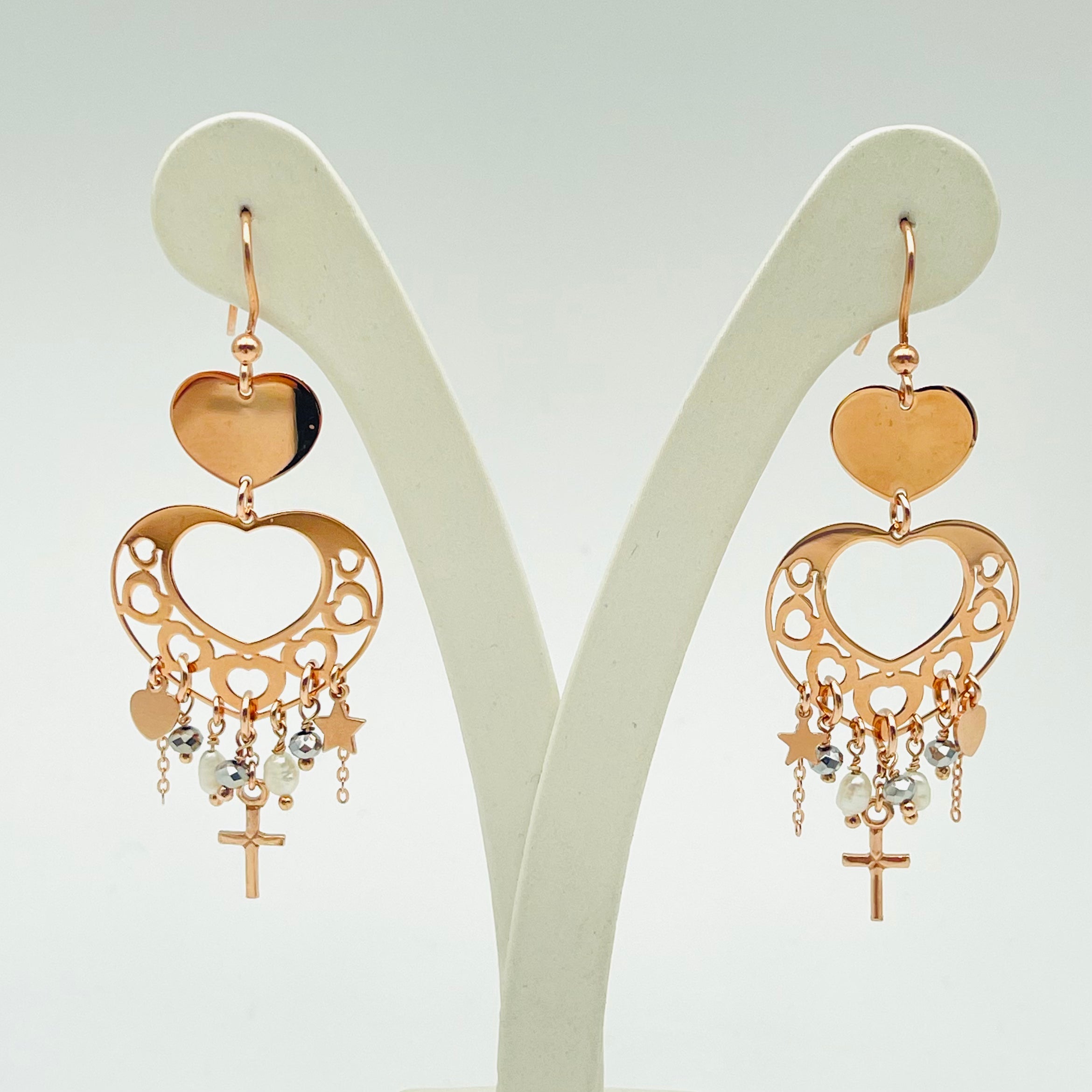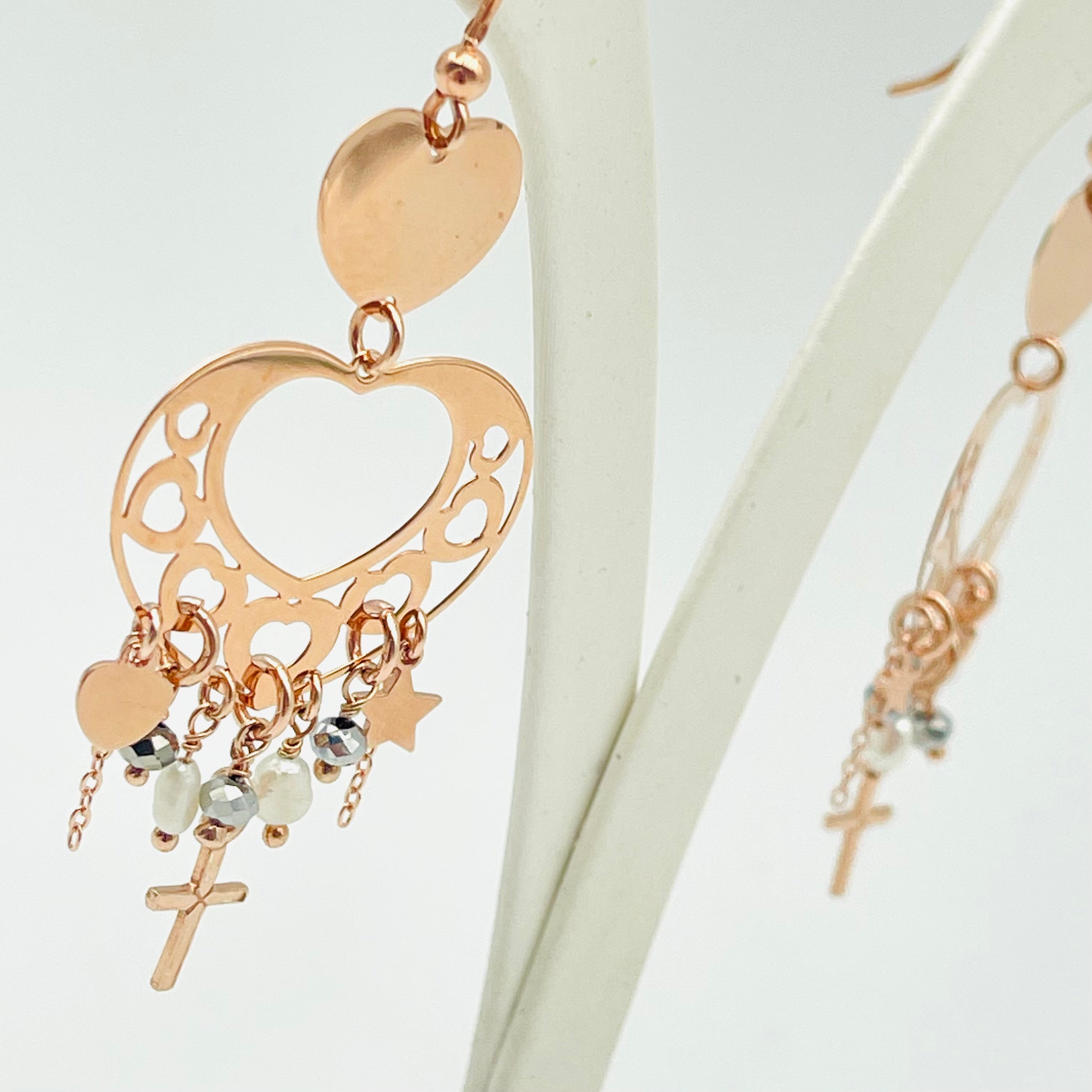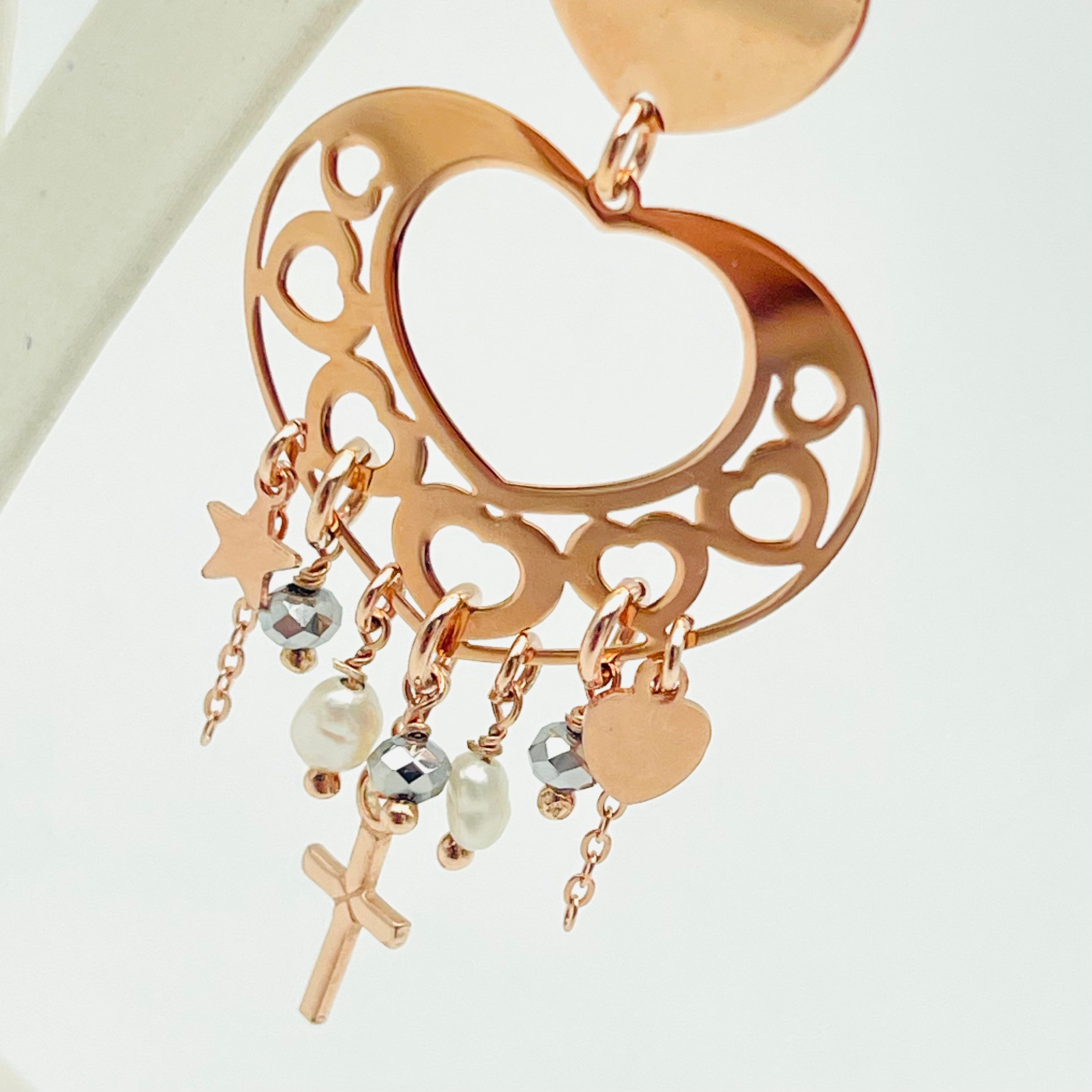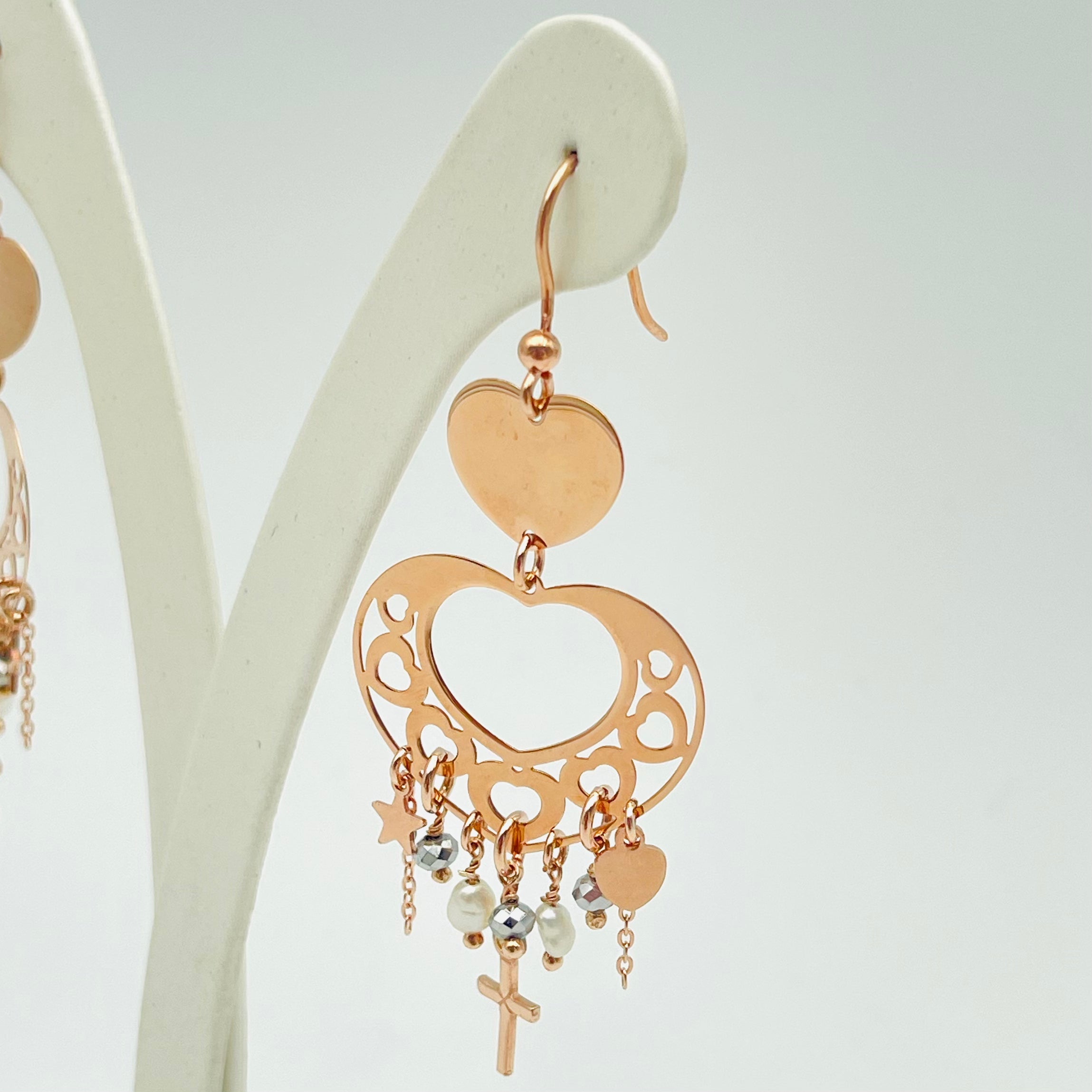 Orecchini pendenti in argento colore rosè a forma di cuore con charms a cuore, croci e perle di fiume.